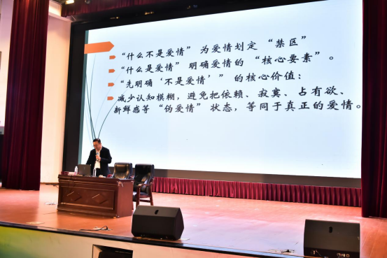 讲座伊始,蒋教授从“愛”字的字形结构入手,解析其“以心为核、以友为基”的深刻内涵,强调爱是“发自内心的真诚联结”。他引用哲学家奥尔特加·加塞特的观点,指出“认识爱,从认识什么不是爱开始”,并详细剖析了六种“伪爱情”类型,引导师生辨别真爱与依赖、占有、功利等情感混淆的现象。