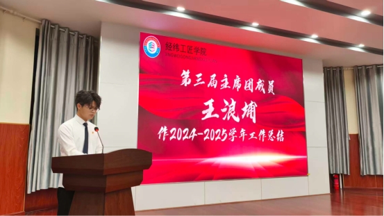 第三届学生会主席团代表王浪埔作工作汇报。他全面梳理了过去一年学生会在校园文化建设、学风建设、服务保障等方面的具体举措与成果,分享了工作中的成长感悟与经验教训,既展现了第三届成员的责任担当,也为第四届学生会开展工作提供了宝贵参考,赢得现场阵阵掌声。