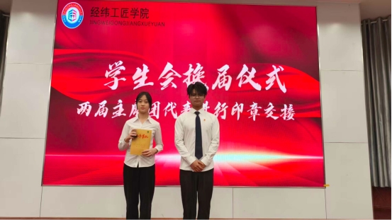 两届学生会主席团代表进行学生会印章交接仪式。第三届主席团代表王浪埔郑重将学生会印章交予第四届主席团代表李露,印章的传递不仅是身份与职责的交接,更承载着“为同学谋便利、为学院促发展”的责任,象征着学生会服务精神的薪火相传。