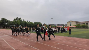 仪式开始,护旗队护卫国旗迈着整齐步伐入场。国歌奏响,五星红旗冉冉升起,全体师生肃立注目、高唱国歌,现场庄重肃穆。