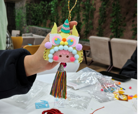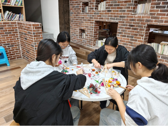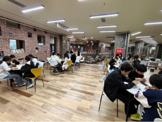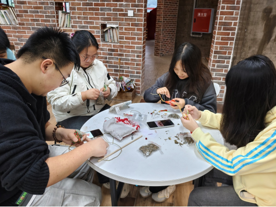 经纬1901阅读书吧内,大家一边交流制作心得,一边专注地穿针引线、捶打艾草、描绘扇面,不时向工作人员请教遇到的问题,现场充满了欢声笑语。有的学生在香囊上绣出精致的花纹,有的学生在团扇上画出独具特色的菊花造型,每一件作品都融入了学生们对传统节日的理解与热爱。