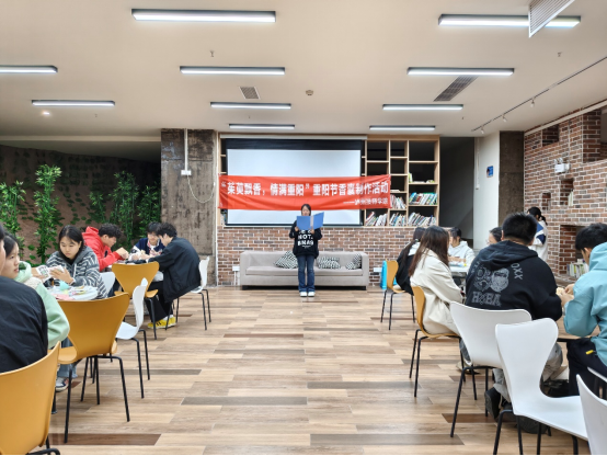 活动伊始,主持人以生动的演讲形式拉开帷幕。从重阳节的起源说起,详细讲述了“桓景避瘟”等经典历史故事,让在场学生了解到重阳节最初的祈福避灾寓意;又介绍了登高、赏菊、插茱萸、饮菊花酒等传统习俗的演变,同时结合当下社会背景,阐释了重阳节在现代社会中“尊老敬老、传承家风、珍惜时光”的新意义。精彩的讲解让学生们对重阳节有了更全面、深刻的认知,也为后续的手工制作环节奠定了浓厚的文化基础。